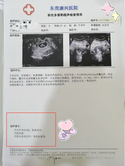 在我院不孕不育专科团队的专业治疗下,经过两个月的查因和调理,她终于迎来了转机。一次促排卵治疗成功后,她成功怀孕,并在测出怀孕后立即接受了我院的精准保胎治疗,从营养饮食、心理调适到定期产检、专业指导,每一个环节都力求做到最好。如今,已孕7周的她,胚胎健康存活,正稳步迈向幸福的未来。这个夏天,对她来说,无疑是充满希望和生机的。